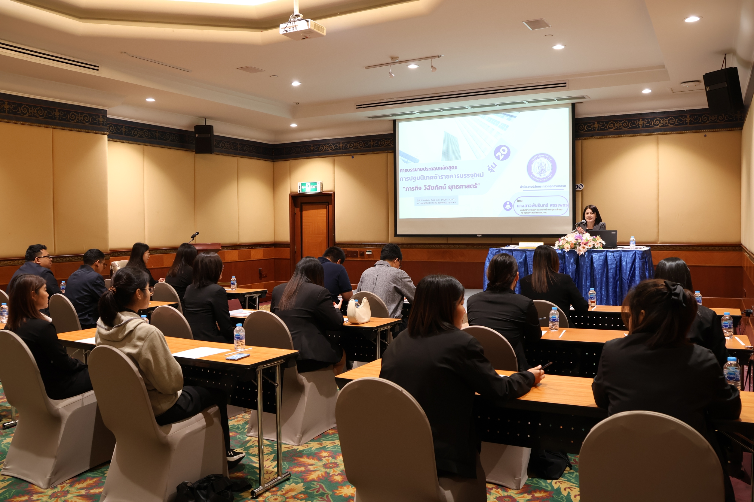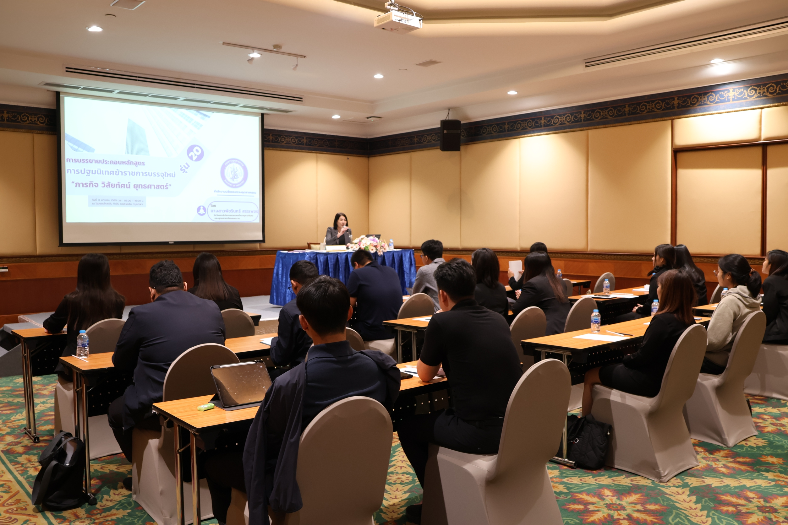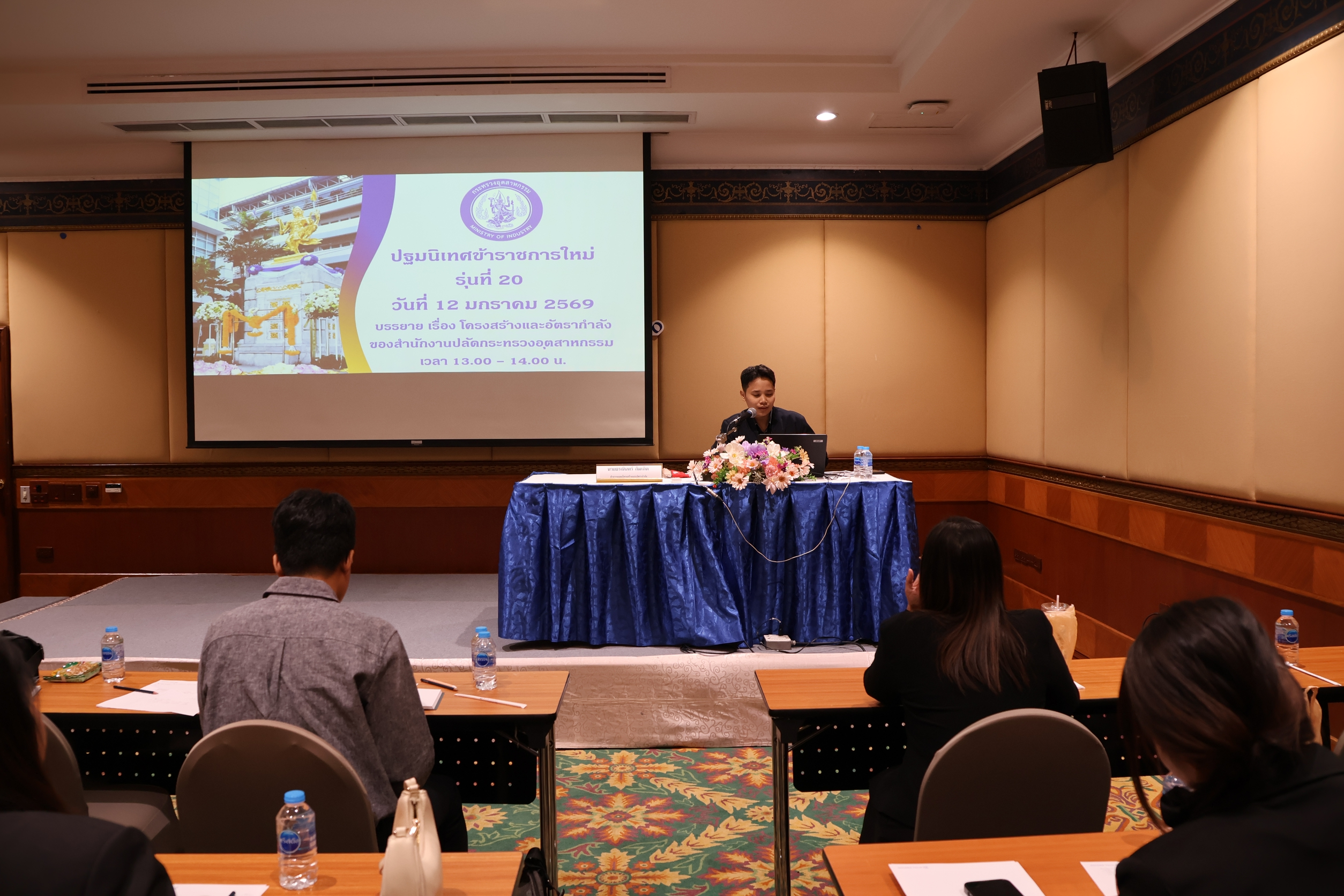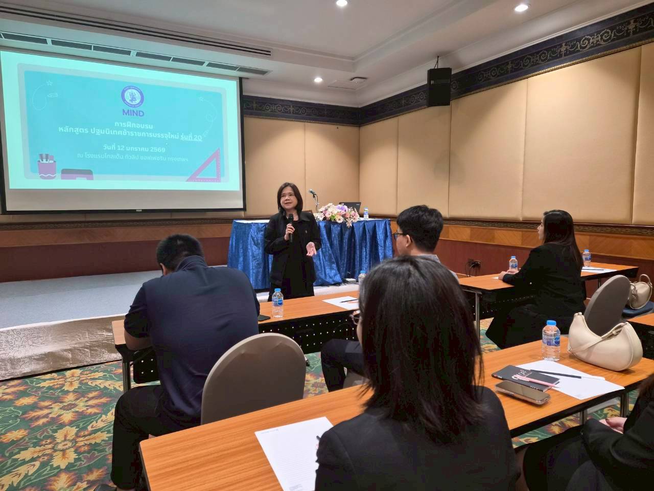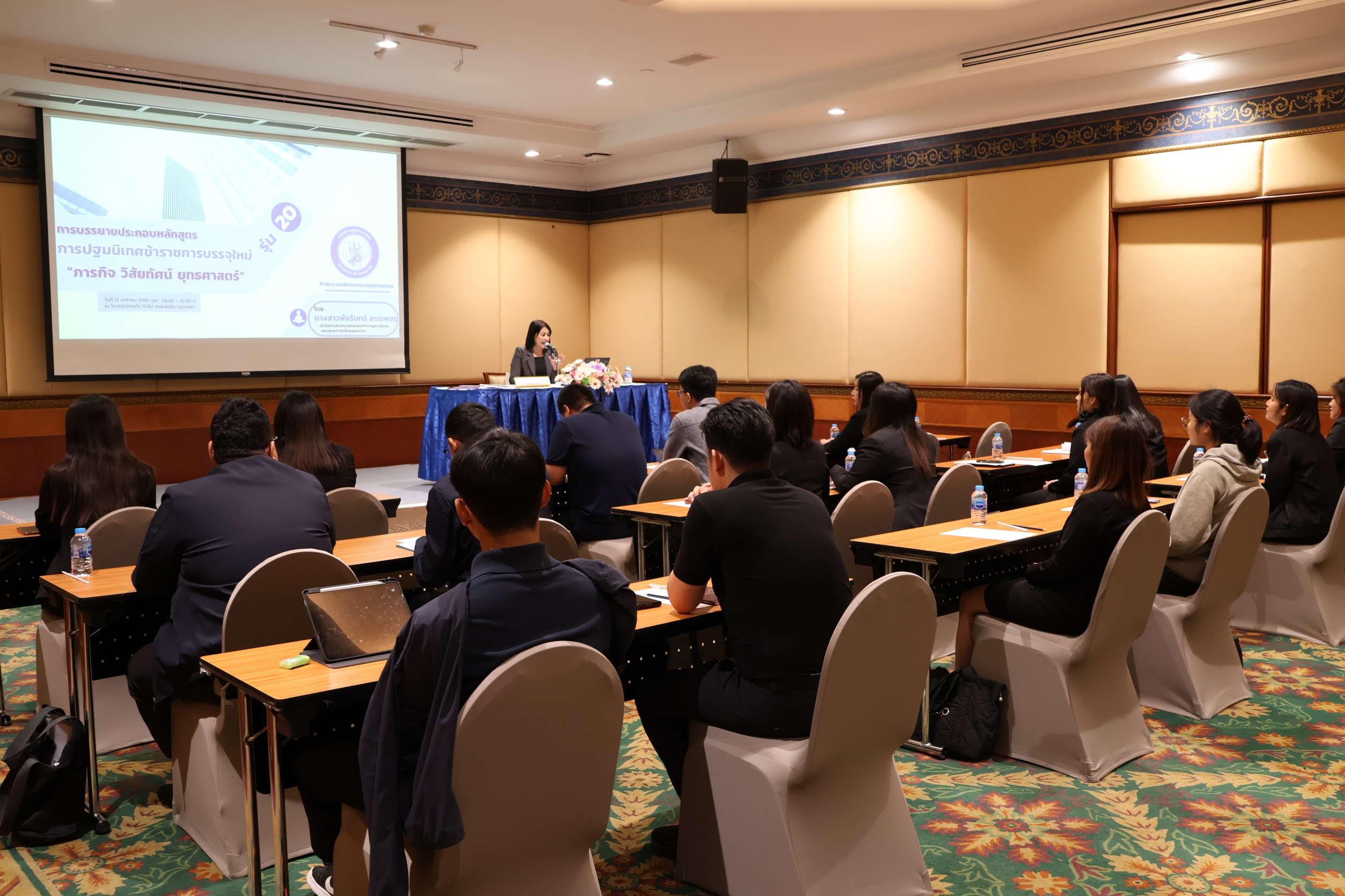 กองบริหารทรัพยากรบุคคล สำนักงานปลัดกระทรวงอุตสากรรม ได้จัดการฝึกอบรม หลักสูตร ปฐมนิเทศข้าราชการบรรจุใหม่ รุ่นที่ 20 เมื่อวันที่ 12 มกราคม 2569 ณ โรงแรมโกลเด้น ทิวลิป ซอฟเฟอริน กรุงเทพฯ โดยมี นางนฤมล ลือสุขประเสริฐ นักทรัพยากรบุคคลชำนาญการพิเศษ รักษาการในตำแหน่งผู้อำนวยการกองบริหารทรัพยากรบุคคล เป็นประธานในพิธีเปิดการฝึกอบรมฯ