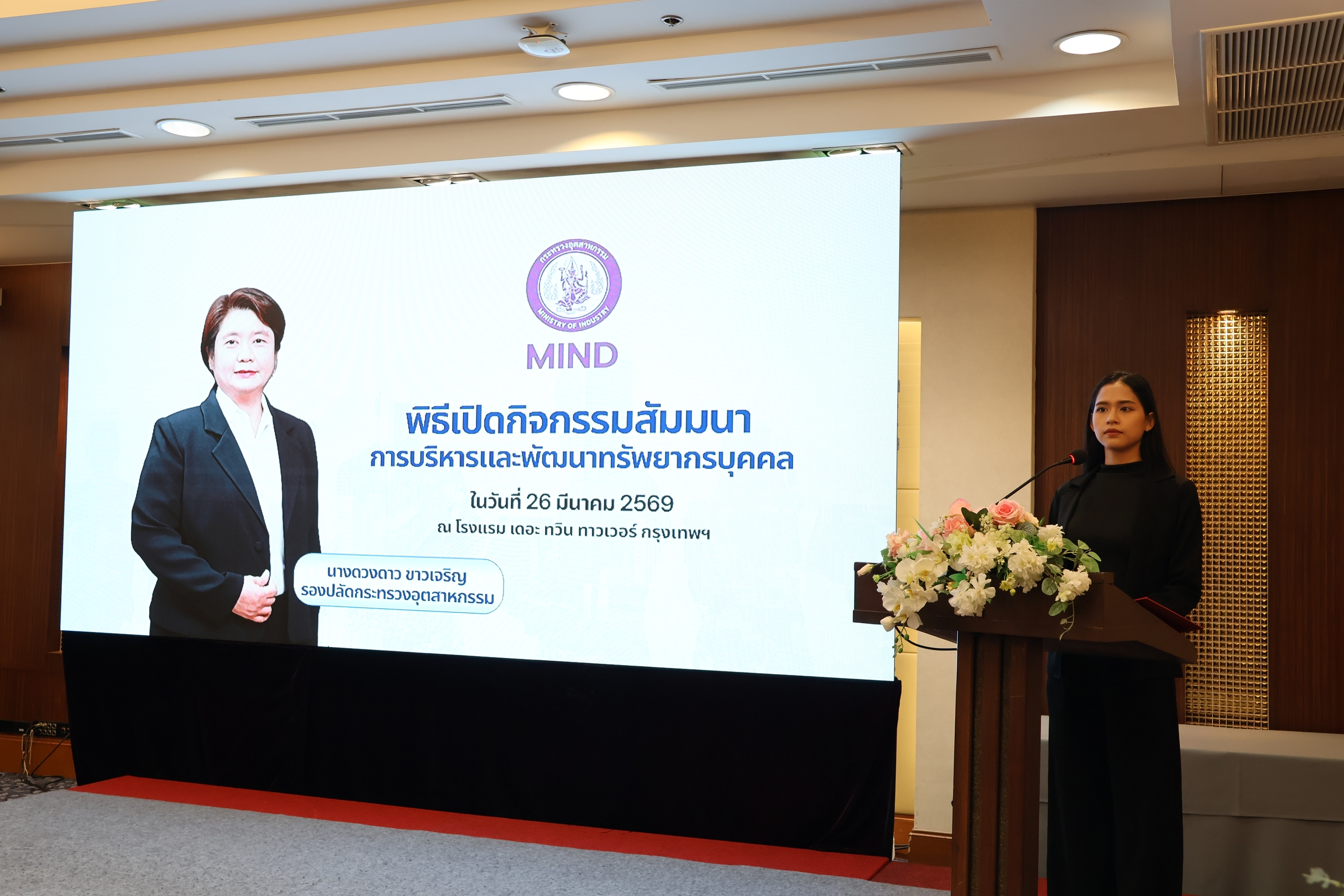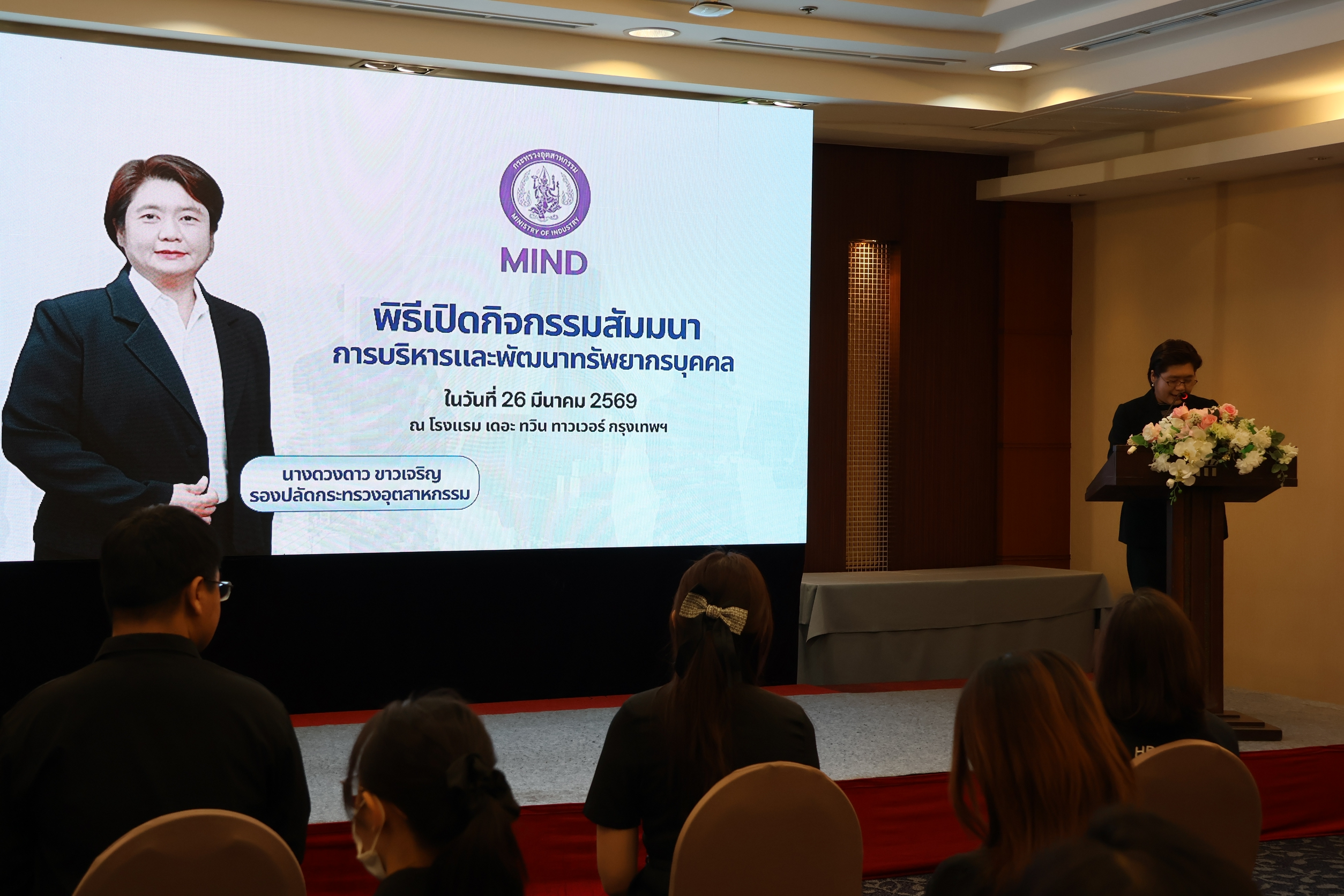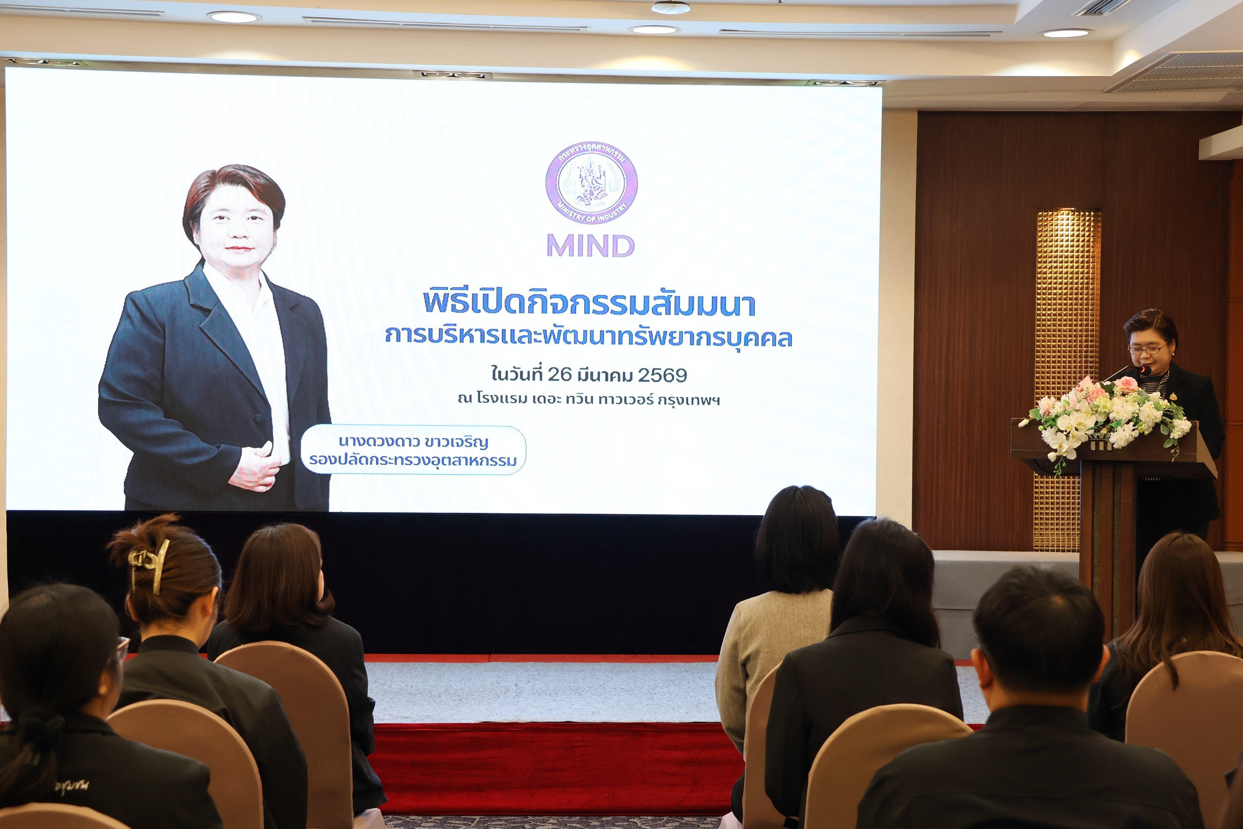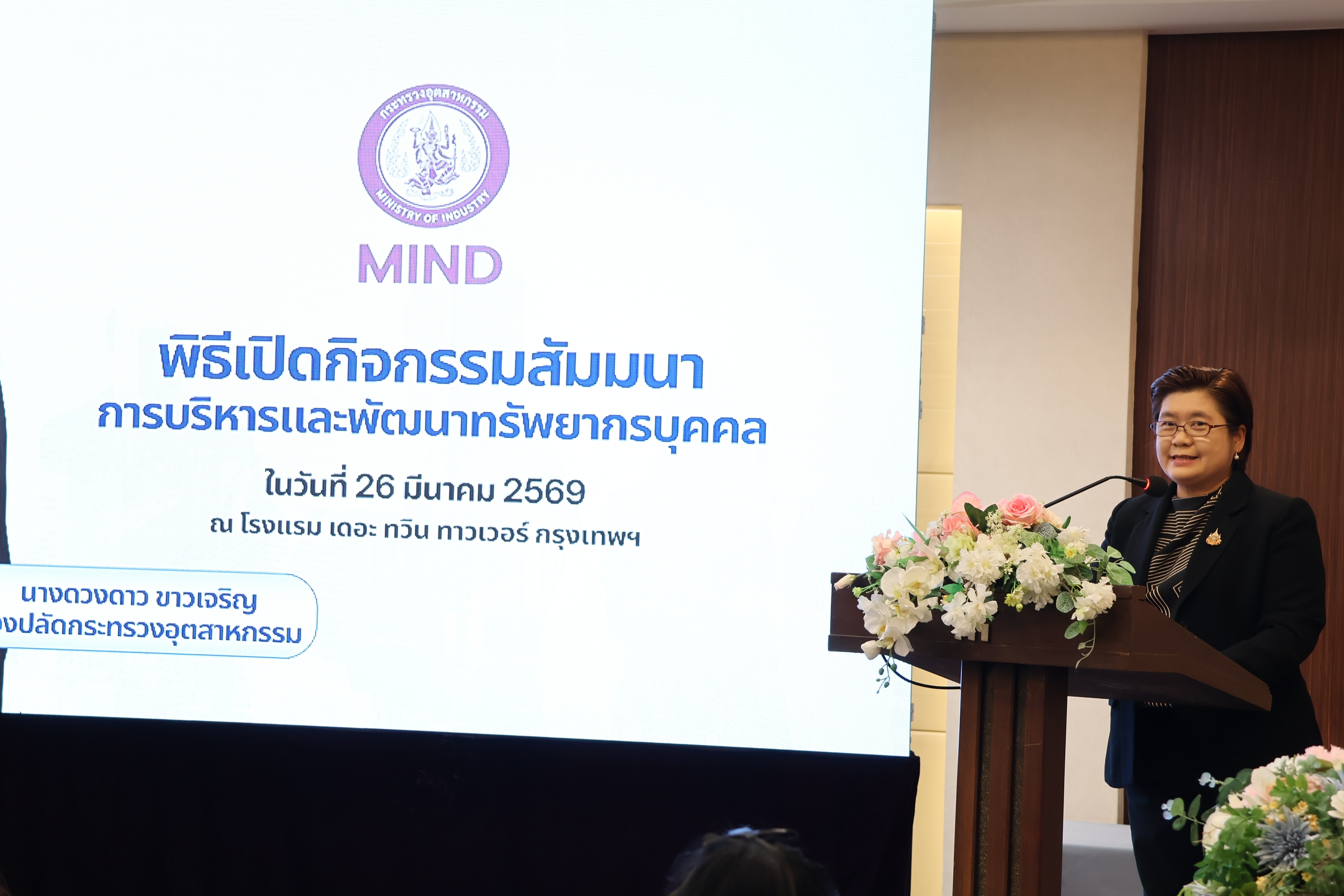 กองบริหารทรัพยากรบุคคล สำนักงานปลัดกระทรวงอุตสากรรม ได้จัดกิจกรรมสัมมนาการบริหารและพัฒนาทรัพยากรบุคคล ระหว่างวันที่ 26 - 27 มีนาคม 2569 ณ โรงแรม เดอะ ทวิน ทาวเวอร์ กรุงเทพฯ โดยมี รองปลัดกระทรวงอุตสาหกรรม (นางดวงดาว ขาวเจริญ) เป็นประธานในพิธีเปิดการฝึกอบรมฯ และกล่าวรายงานโดย นางนฤมล ลือสุขประเสริฐ รักษาการในตำแหน่งผู้อำนวยการกองบริหารทรัพยากรบุคคล โดยมีวัตถุประสงค์เพื่อเสริมสร้างความรู้ความเข้าใจเกี่ยวกับระเบียบการปฏิบัติงานด้านการบริหารและพัฒนาทรัพยากรบุคคล และการสร้างเครือข่ายในการปฏิบัติงานร่วมกันของนักทรัพยากรบุคคลของกระทรวงอุตสาหกรรม